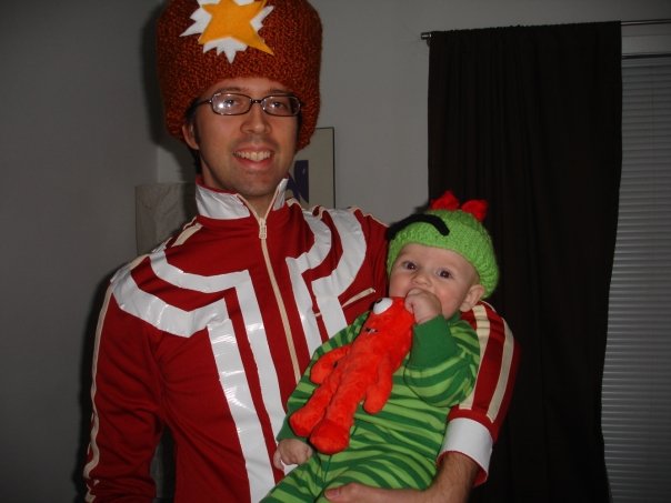 Since he was old enough to see the television screen Jude has been in love with Yo Gabba Gabba. To be honest I think it has a lot to do with the fact that Joe and I also really love the show. For his first Halloween costume we dressed in up in a homemade costume as Brobee and Joe dressed up in homemade costume as DJ Lance.